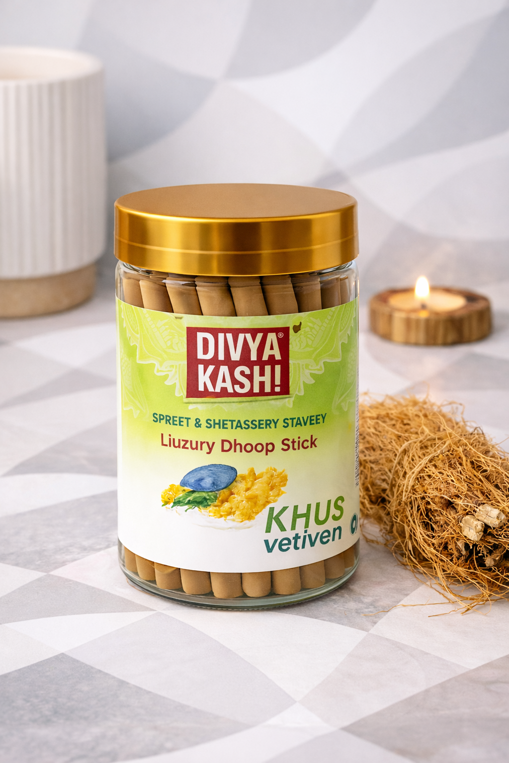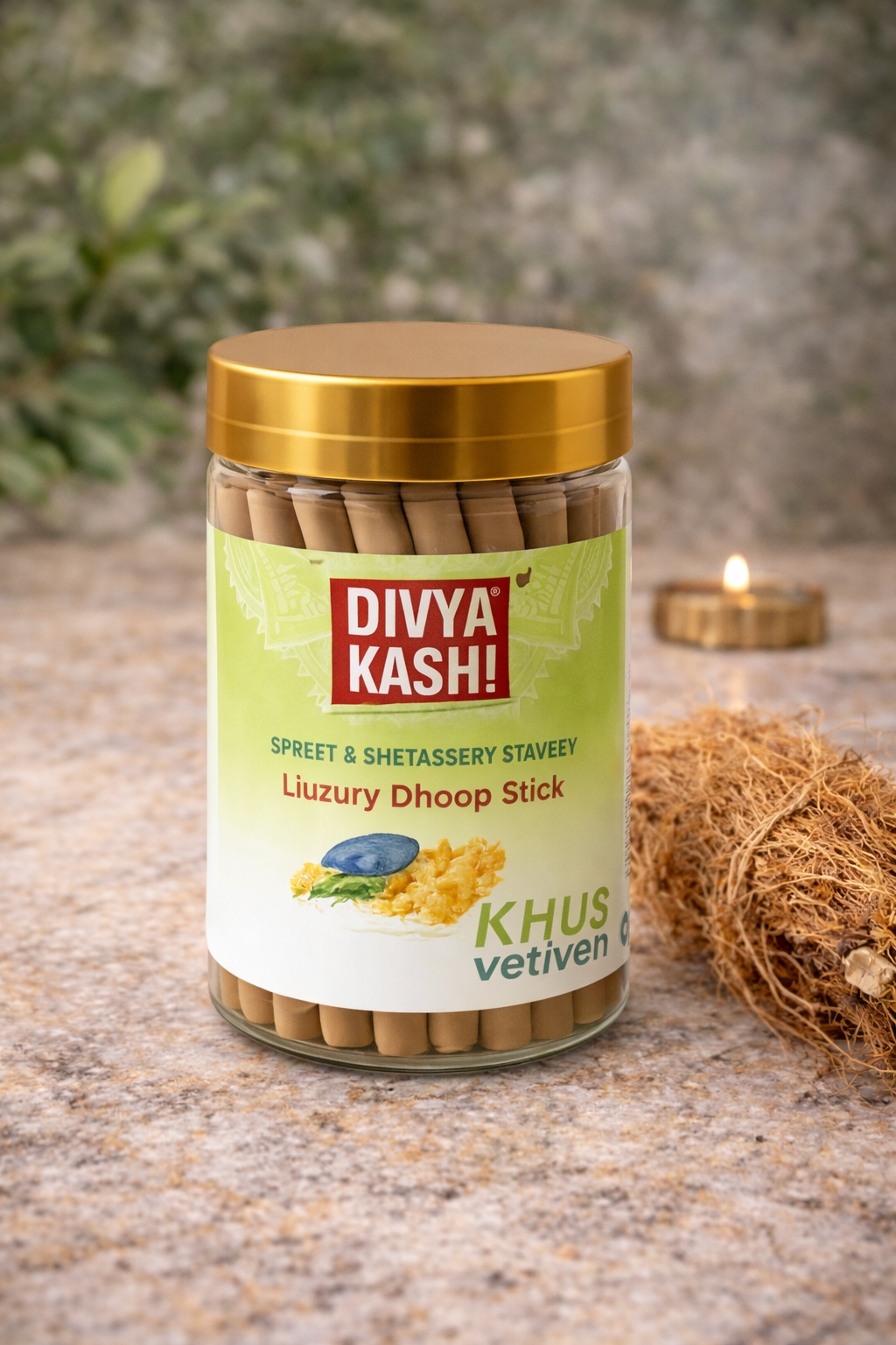 Divya Kashi Khus Dhoop Stick, a premium incense inspired by the timeless aroma of Khus (Vetiver). Known for its deep, earthy, woody, and cooling fragrance, Vetiver has been revered in Ayurveda for its calming and grounding properties.