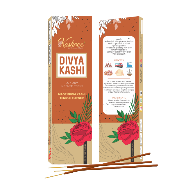 Experience the divine blend of tradition and luxury with our Divya kashi Musk Rose incense sticks. Each stick is lovingly handcrafted using sacred flowers offered at the holy temples of Kashi, bringing the essence of devotion into every fragrance.